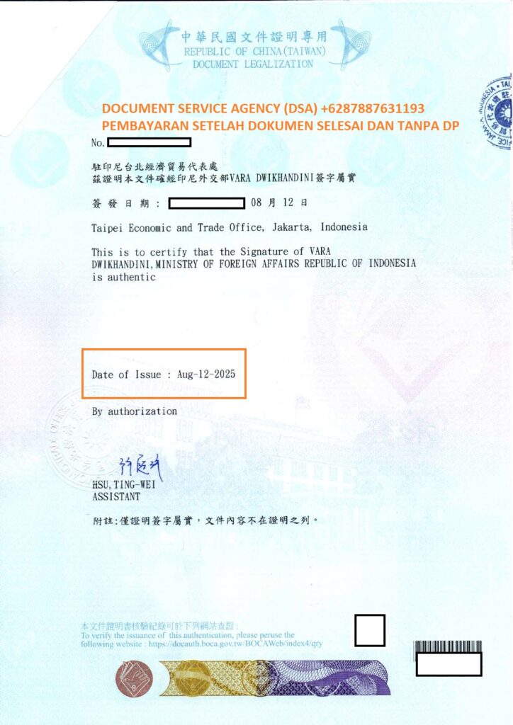 Document Service Agency (DSA) adalah spesialis jasa terjemah, legalisir, atestasi, apostile dokumen untuk keperluan di luar negeri dan pengurusan visa berpengalaman dan terpercaya. Bagi anda yang ingin melegalisir ijazah di Kedutaan Taiwan untuk study, keperluan bekerja, pengurusan visa, izin tinggal, dan lain-lain. Percayakan legalisir dokumen anda kepada kami, dengan layanan ” Pembayaran Setelah Dokumen Selesai dan Tanpa DP ” anda akan merasa lebih nyaman dan aman menggunakan jasa kami. Dan dalam hitungan beberapa hari dokumen anda selesai dan siap untuk digunakan.