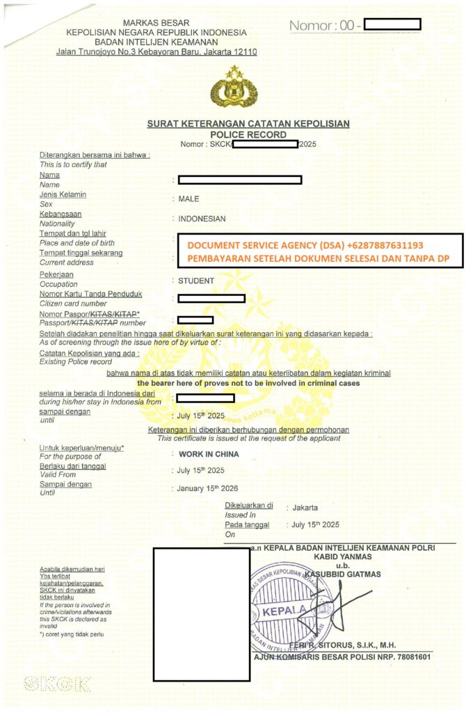DSA (Document Service Agency) adalah spesialis jasa terjemah, legalisir, atestasi, apostile dokumen untuk keperluan di luar negeri dan pengurusan visa berpengalaman dan terpercaya. Bagi anda yang ingin melegalisir SKCK di Kedutaan China untuk keperluan bekerja, pengurusan visa, izin tinggal, dan lain-lain. Percayakan legalisir dokumen anda kepada kami, dengan layanan ” Pembayaran Setelah Dokumen Selesai dan Tanpa DP ” anda akan merasa lebih nyaman dan aman menggunakan jasa kami. Dan dalam hitungan beberapa hari dokumen anda selesai dan siap untuk digunakan.